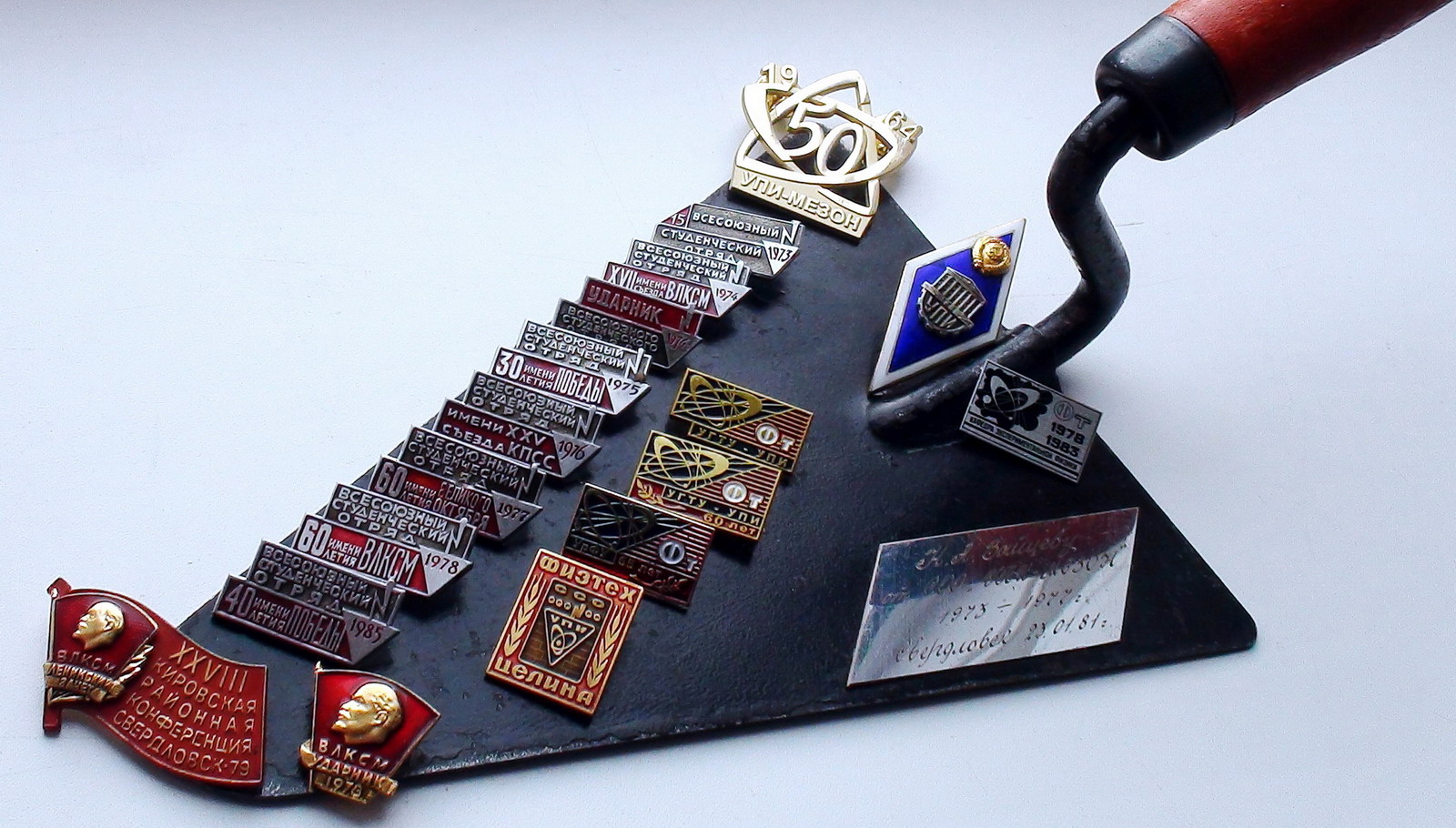 ![]() Фотозначок 1970 год. АЛЕКСАНДР БАЛАШОВ "ПРО ЗНАЧОК " УПИ - МЕЗОНА " Перед целиной 1970 года очень много идей сгенерировал Женя Королев, человек яростно активный. Одна из первых идей это " мастерок ". Доска объявлений отряда. Оформлена в виде мастерка. Доску из фанеры стремительно изготовил Толик Устюгов, а вот красить пришлось мне. А Боря Канашов ( жили в одной комнате ) как раз в это время где-то разжился рельефными красками, вот ими я и воспользовался, и недели не прошло, как доска уже висела на стене около входа в подземный переход со стороны физтеха.На натянутые лески бойцы отряда навешивали записочки друг для друга. Идею подхватили и другие отряды, но форма мезоновской доски была уникальной.Между прочим, через много лет ( тридцать или около того ) я услышал, как студенты УРГУ назначают встречу в холле " около мастерка ". Тут же к ним прицепился с вопросами :- А где это? А откуда взялось ?, А когда появилось ?.. Получил лишь один ответ, что в холле главного здания УРГУ, на остальные вопросы лишь пожимали плечами. Но мы - то знаем !!! Май 1970 года... Сессия то ли уже идет, то ли вот-вот начнется, а у Королева новая идея, сделать значок отряда. Заказывать? Глухо ! Но идея хороша, слов нет ! И вот Ваш покорный слуга уже на ватмане тушью чертит образец размером где-то сорок на пятнадцать сантиметров. Ну, отрезки прямых - это запросто, а как быть со " звездочкой "? Вот уж я повозился с вырисовыванием ! Кстати, звездочка эта - это так называемая " розетка Зоммерфельда ", физики поймут. Вот бы узнать, кто первым использовал её для эмблемы ! Ведь гениально ! Потом фотографируем фотоаппаратом на штативе. И ведь не сразу получается, важно осветить равномерно. А уж потом печатаем контактной печатью на здоровенном листе фотобумаги. Получаем штук пятьдесят изображений значка. Каждое вырезаем, наклеиваем на подготовленные кусочки жести с припаянной уже иглой ( ну не было у нас маленьких булавок ). Из-за этих игл быстро растеряли эти значки, но эффект был хорош ! Уже позже в 1971 году пытались сделать значки в типографии " Уральского Рабочего " методом цинкографии, но очень уж блёкло получалось. Кто-то с кем-то договорился, и пробовали сделать значки зеркальным напылением на стеклянную основу, но стойкость покрытия оказалась невелика. Источник |