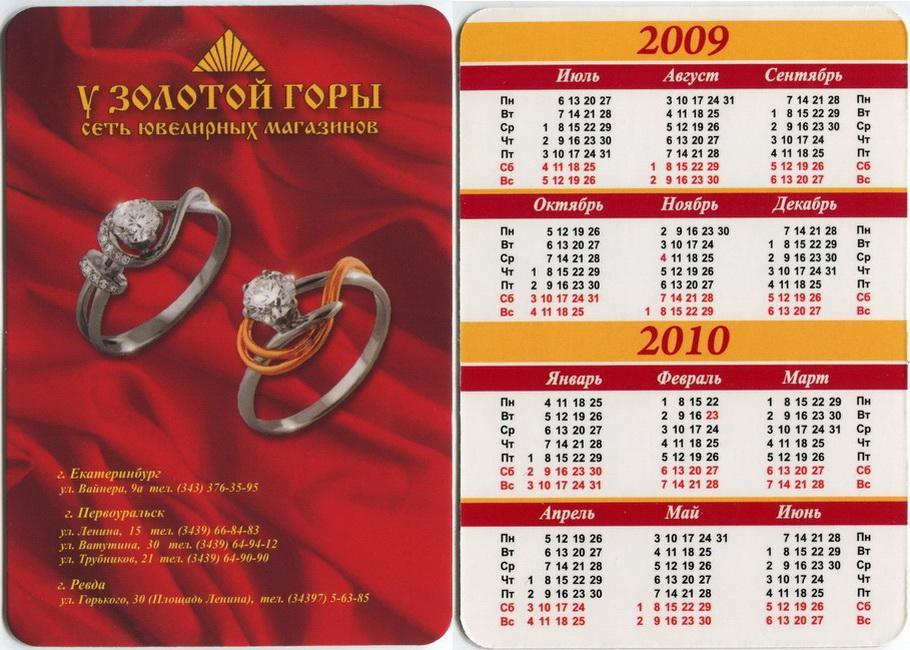 Карманный календарик "Свердловская область. Сеть ювелирных магазинов «У золотой горы». 2009-2010 гг."