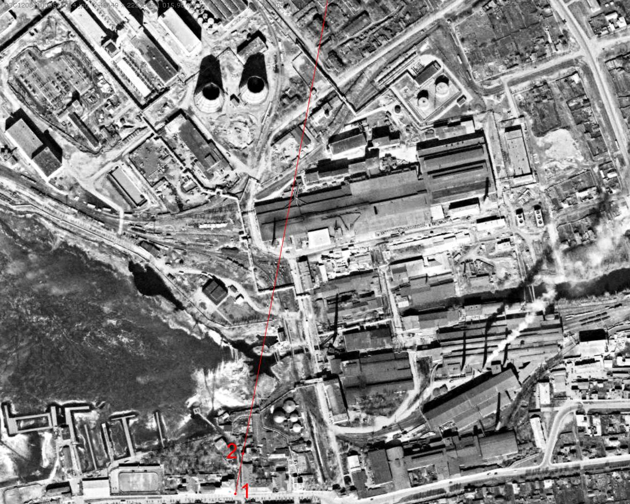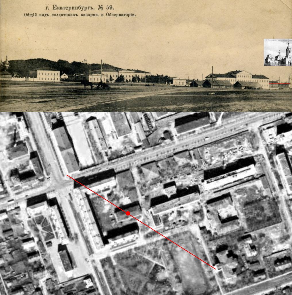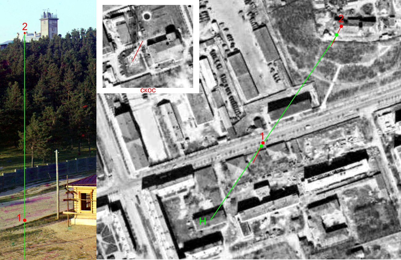 Кирова 36 (точка 1): https://goo.gl/maps/UiuDpgX9iXw75uj67 и Школьников 1 (точка 2): https://goo.gl/maps/rqxNdbZb3tpxeWgd8 указывает на точку съёмки где-то около КПП: ![]() Из-за повышения рельефа направляющая около КПП проходит где-то под землей. Но так как скос на этом спутниковом снимке почти совпадает с направляющей, то погрешность при определении положения направляющей на поверхности будет небольшая, метров пять правее. Причём точка съёмки фотографии 1870 года ещё немного правее. Но вот у Прокудина-Горского она левее. P.S. Возможно Т-образный домик между КПП и градирней мог относиться к усадьбе. -------------------- Ответы на все вопросы, связанные с гибелью группы Дятлова: