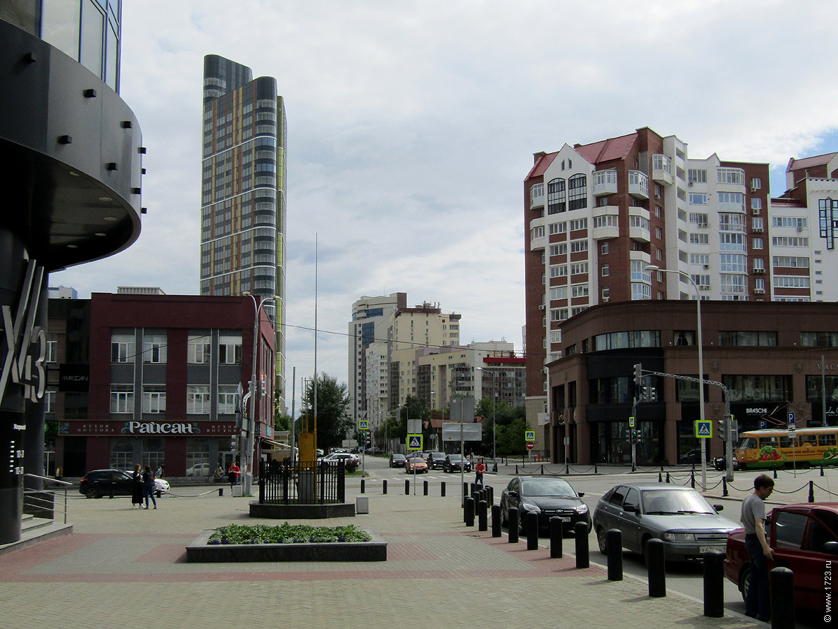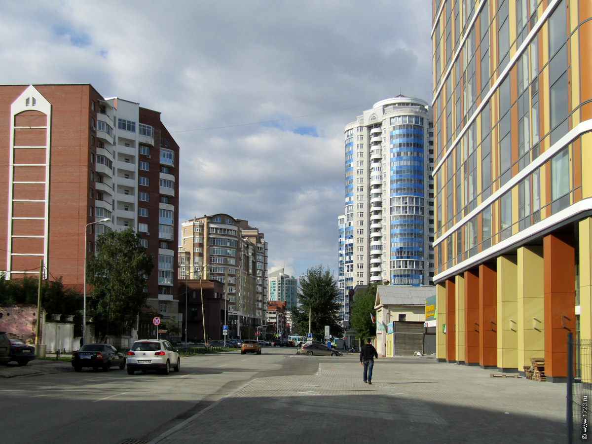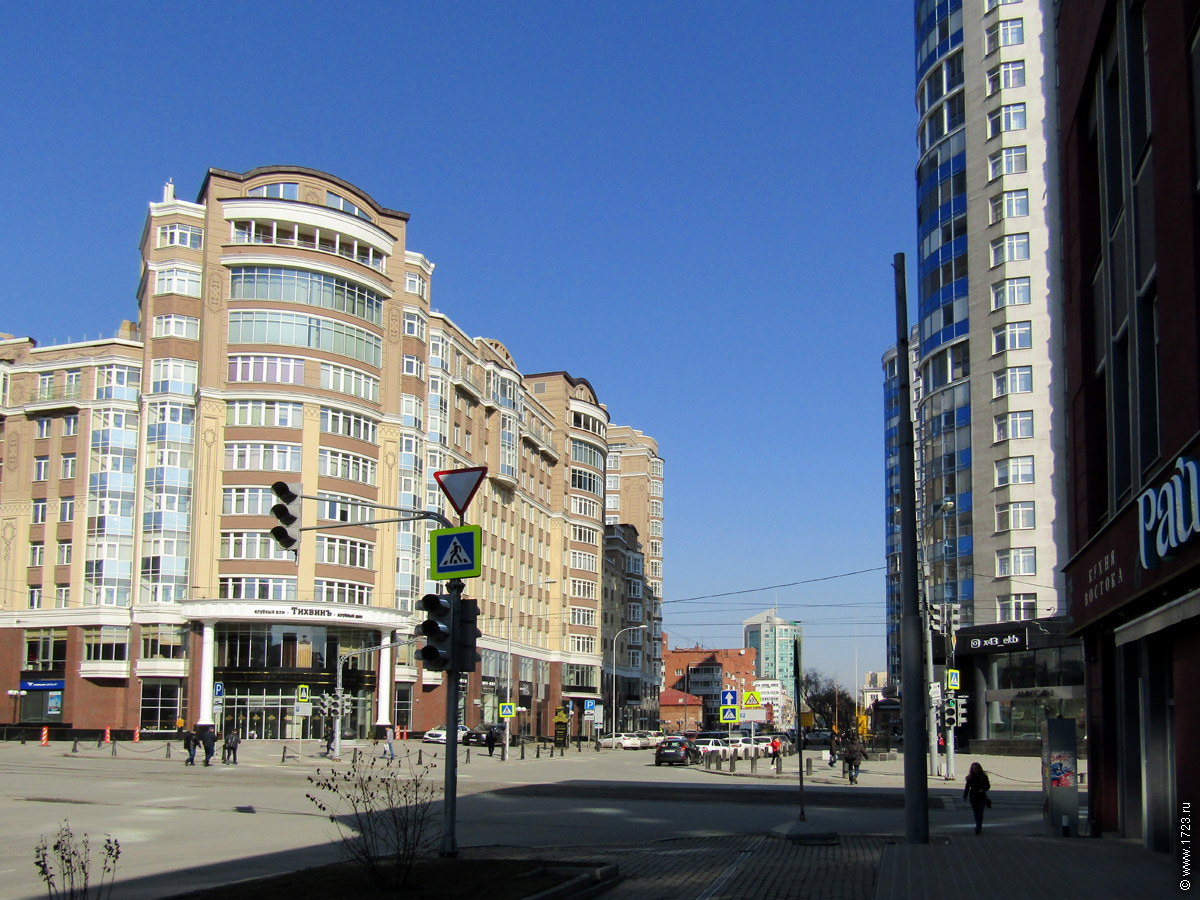 В центре ЖК "Тринити" (Хохрякова, 63). ![]() Вид на перекрёсток Хохрякова - Куйбышева. Слева фрагмент УГГУ (Куйбышева, 30). Справа фрагмент ТЦ "Весенний" (Хохрякова, 98). ![]() |