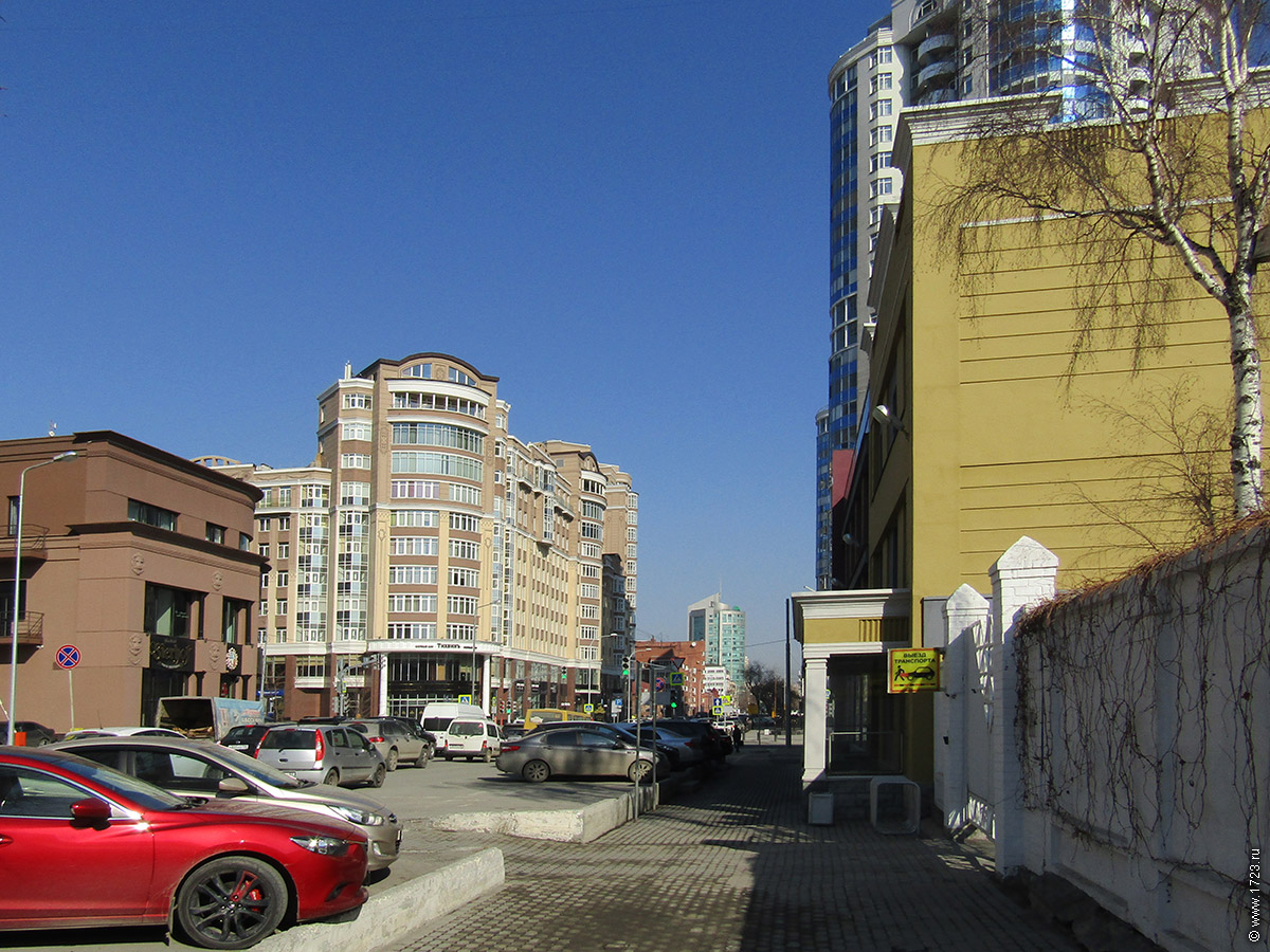 Слева БЦ "Кристалл" (Хохрякова, 74). Справа музейный корпус УГГУ (Хохрякова, 85). ![]() Вид от Куйбышева в сторону Народной Воли. ![]() |
