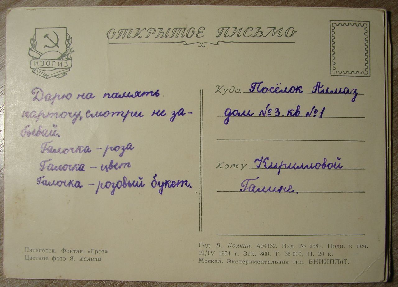 Подарили мне пачку открыток и на одной из них я увидел вот такую надпись. Про букет и мы в детстве писали, но вот адрес … никогда не слышал о таком посёлке.