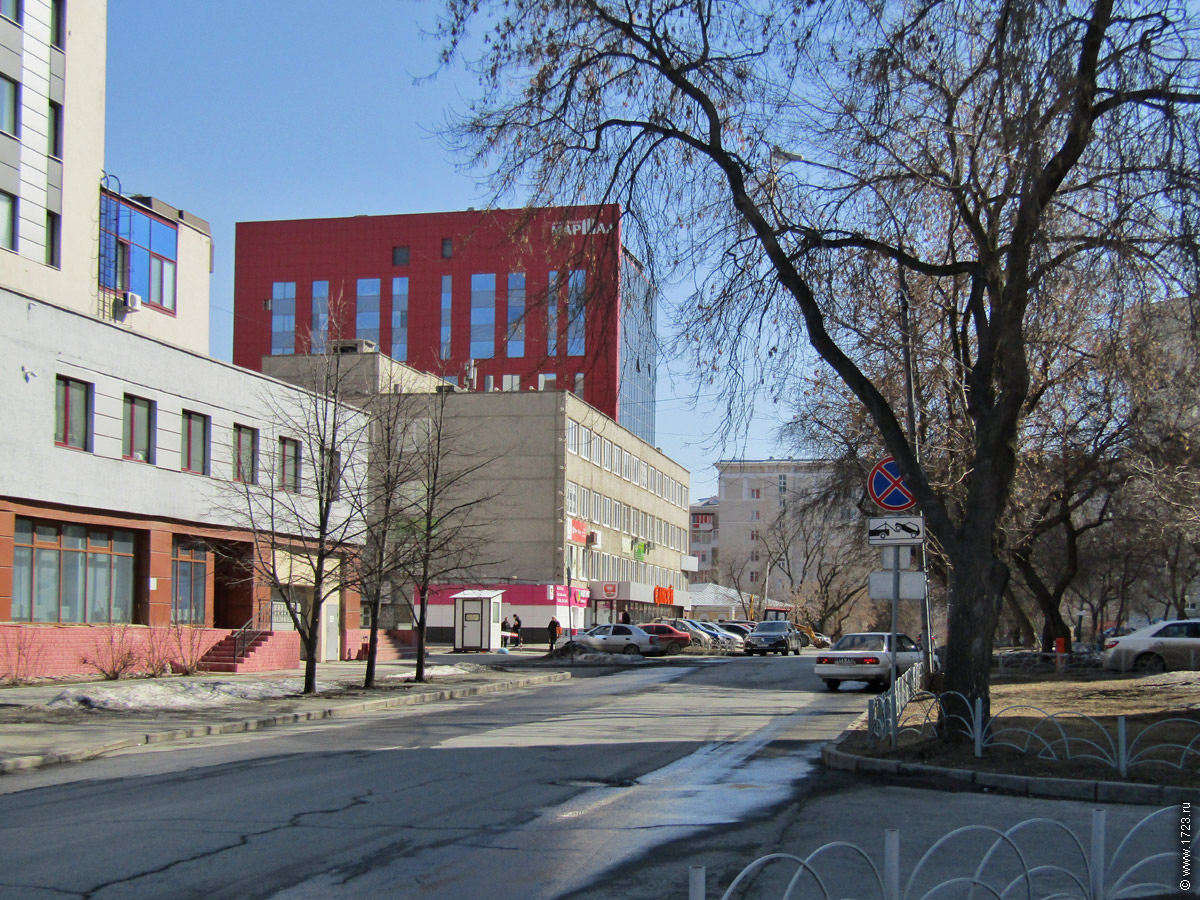 Справа административно-торговое здание (Шейнкмана, 7). ![]() Вид от ДЦ "Маршал" (Шейнкмана, 9) в сторону Челюскинцев. Слева жилой дом (Шейнкмана, 2). ![]() |