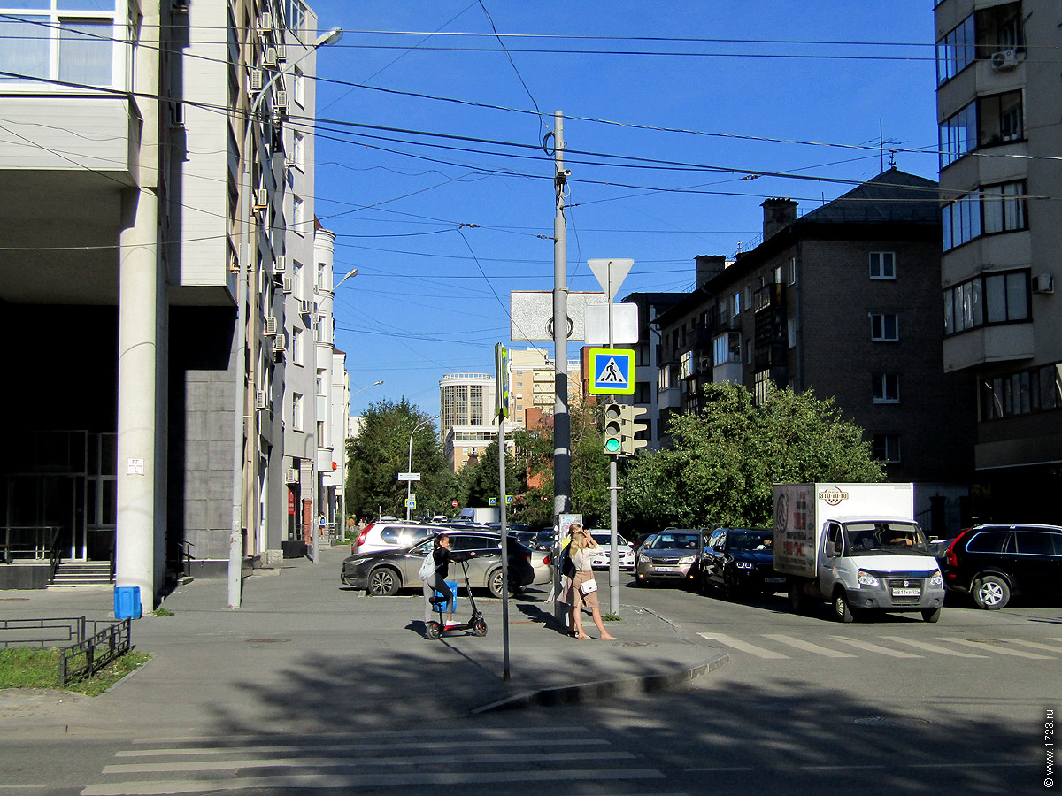 Слева Красноармейская, 62. Справа Энгельса, 17. ![]() Вид от Красноармейской в сторону Мамина-Сибиряка. Слева Энгельса, 19 и 21. Справа Энгельса, 30. ![]() |