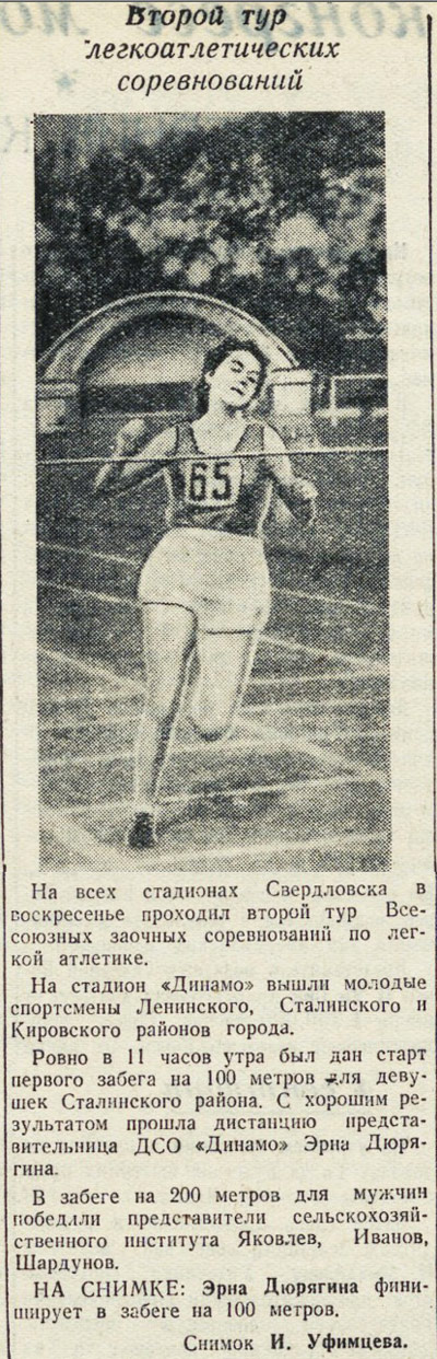 Второй тур легкоатлетических соревнований. "На смену!" 7 сентября 1949г. Метки: Эрна Дюрягина, Шардунов. Про Эрну Дюрягину есть ещё упоминание в газете "За индустриальные кадры" за 1950 год, на второй странице слева. Ссылка |