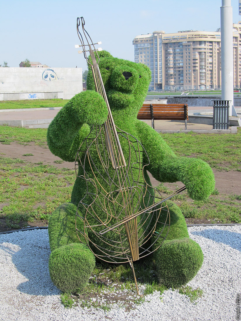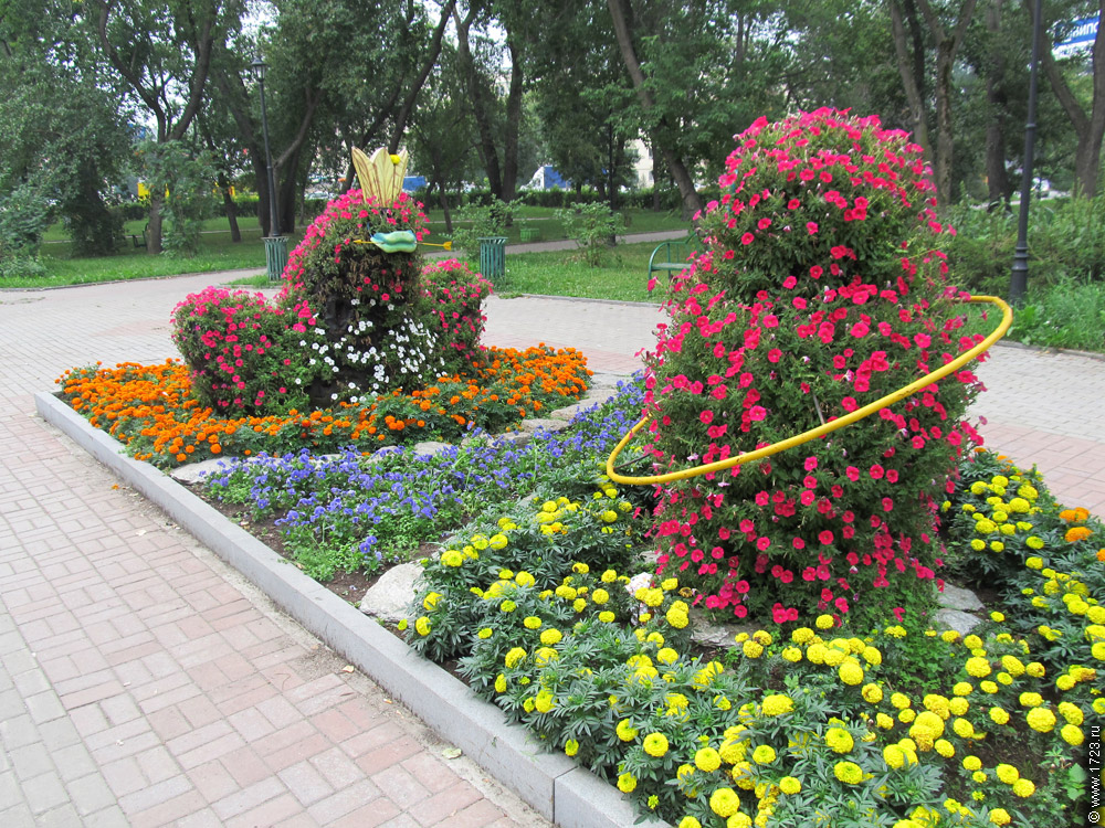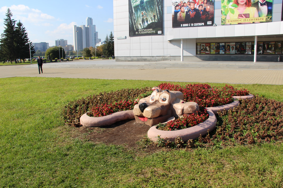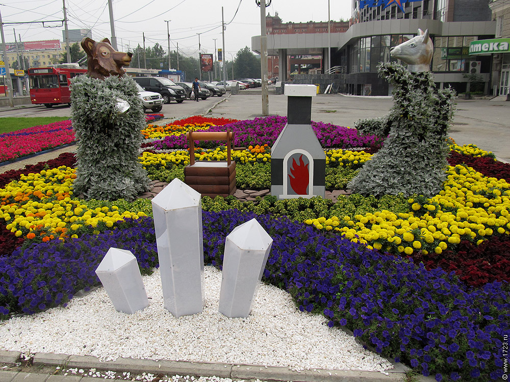 Клумба возле гостиницы "Маринс Парк Отель" (бывшая гостиница "Свердловск"). Установлены цветочные фигуры лисы и медведя.