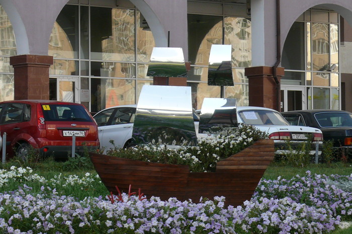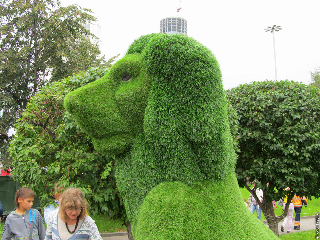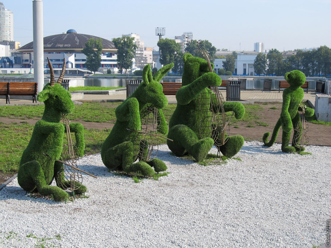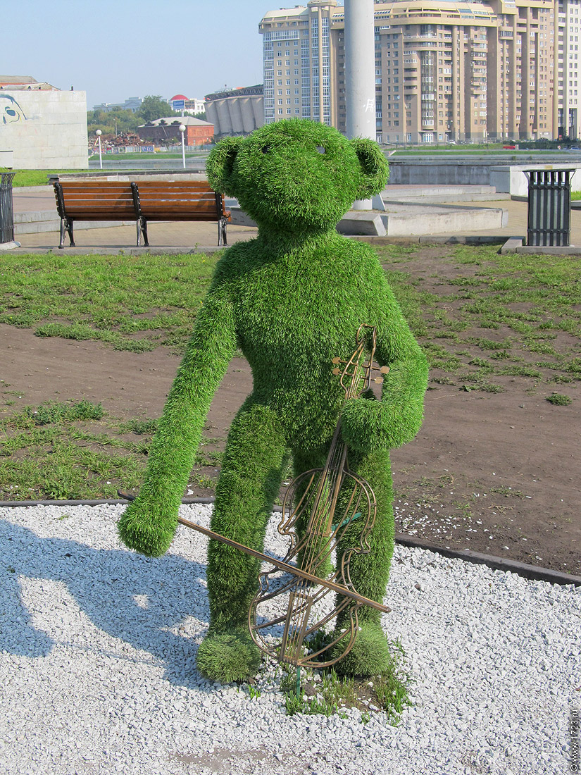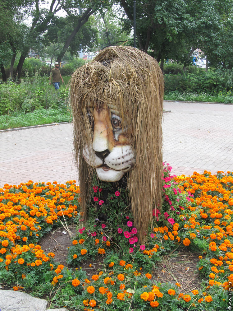 Клумба возле гостиницы "Маринс Парк Отель" (бывшая гостиница "Свердловск"). Установлены цветочные фигуры лисы и медведя.