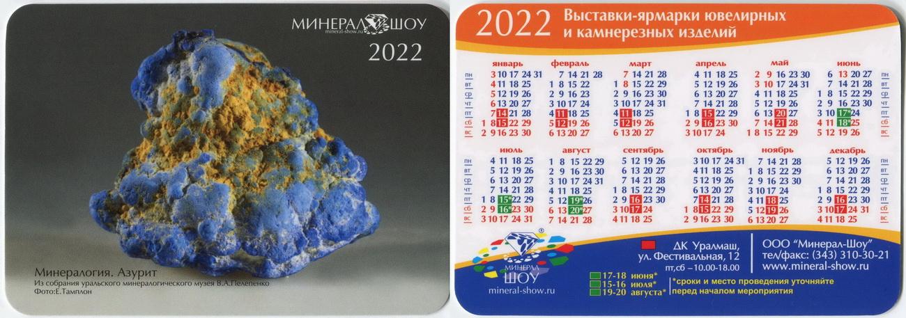 Карманный календарик "г.Екатеринбург. Выставка-ярмарка «Минерал-Шоу». Азурит. 2022 г."