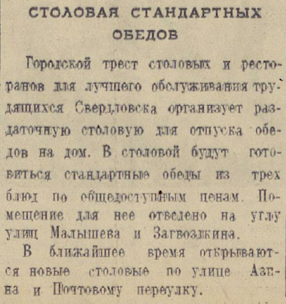 Столовая стандартных обедов. "Уральский рабочий 10 сентября 1941г. В заметке упоминается перекрёсток улиц Малышева и Загвоздкина. Смотрел карты 1947 и 1958 гг., такой улицы на пересечении с Малышева не нашёл. У нас на форуме Anuta-sun писала, что ул. Загвозкина (без "д") - это бывшая 2-я Береговая, сейчас участок ул. Горького от Малышева до Куйбышева. Есть информация, в каком году все три участка улицы Горького были объединены в одну улицу? |