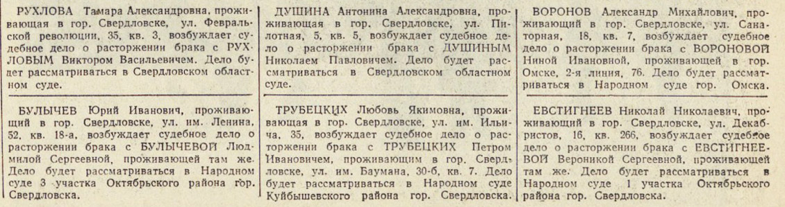 ул.Февральской революции, 35. Рухлов Виктор Васильевич. Булычев Юрий Иванович. ул.Ленина, 52. Булычева Людмила Сергеевна. Душина Антонина Александровна. ул.Пилотная, 5. Душин Николай Павлович. Трубецких Любовь Якимовна. ул.Ильича, 35. Трубецких Петр Иванович. ул.Баумана, 30б. Воронов Александр Михайлович. ул.Санаторная, 18. Воронова Нина Ивановна. Евстигнеев Николай Николаевич. ул.Декабристов, 16. Евстигнеева Вероника Сергеевна. "Вечерний Свердловск" 29 января 1958г. ![]() |