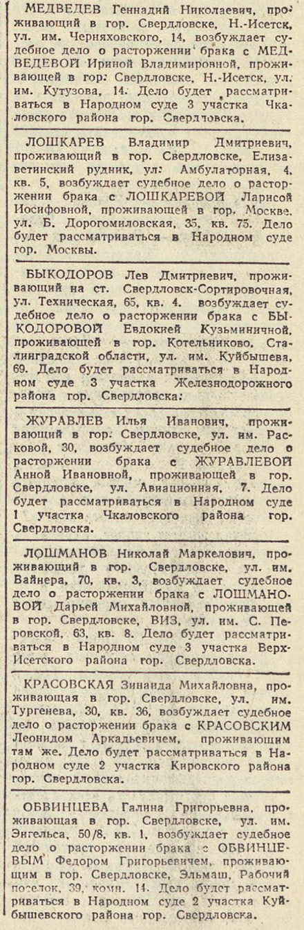 Набережная Рабочей молодежи, 10. Артемьева Мария Гавриловна. Вайнера, 34. Шинкаренко Любовь Васильевна. пос.Бесцементный, дом 1. Шинкаренко Юрий Кузьмич. Моршинин Павел Александрович. ст.Свердловск - Сортировочная. Моршавина Агриппина Анисимовна. Панченко Раиса Григорьевна ул.Червонная, 37. Панченко Василий Пантелеймонович. Шосткин Петр Тимофеевич. ул.Машинистов, 11. Шосткина Мария Петровна. Эльмаш. Рабочий посёлок, 31. Васильев Иван Васильевич. ул.Победы, 39. Васильева Мария Ивановна. Сумин Владимир Михайлович. ул.Фрунзе ,106. Сумина Галина Андреевна. пер.Ялтинский, 18. "Вечерний Свердловск" 14 января 1958г. ![]() |