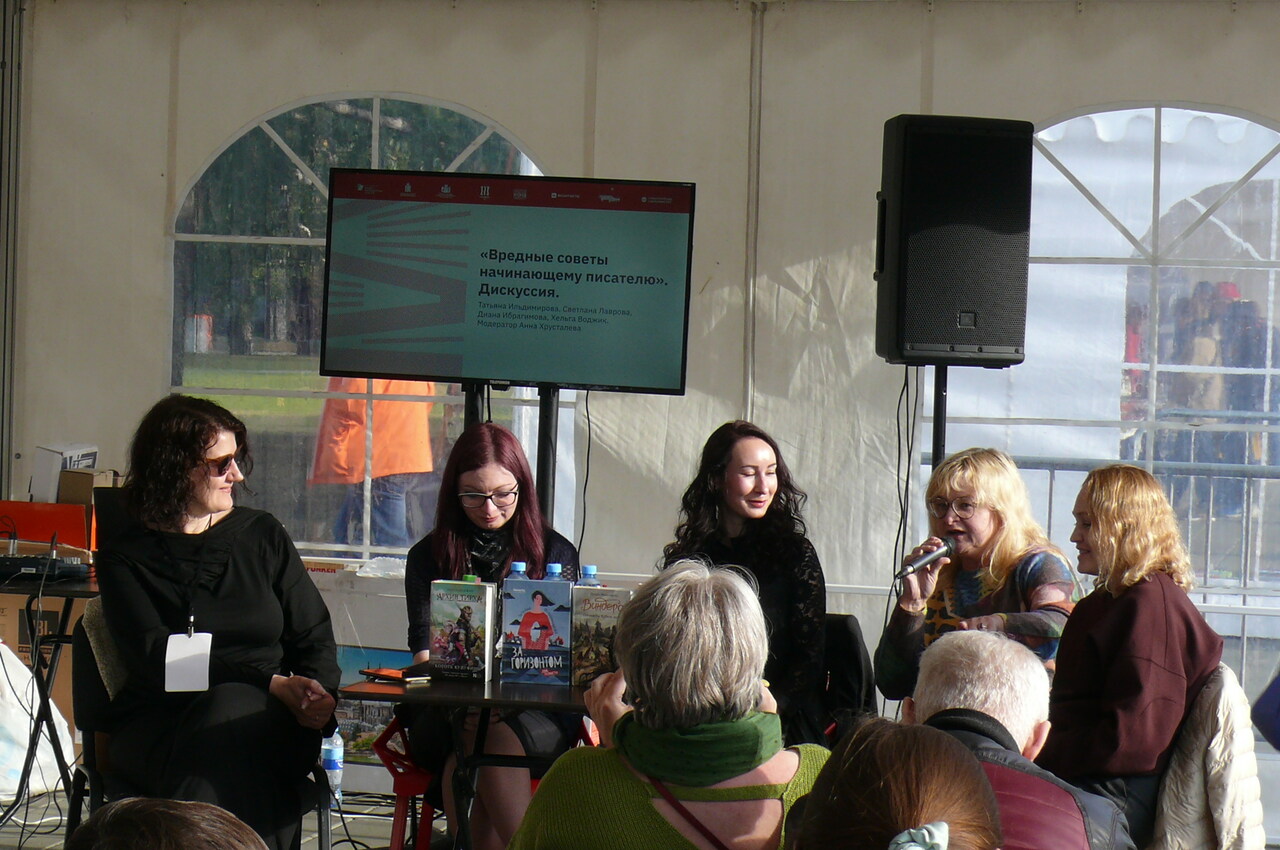 ![]() Писатель Алексей Иванов подписывает книги читателям ![]() Молодые, но тем не менее уже опытные писательницы Татьяна Ильдимирова, Светлана Лаврова, Диана Ибрагимова и Хельга Воджик дают "Вредные советы начинающему писателю". Дискуссия. ![]() Писатель и сценарист Камилл Ахметов презентует свою книгу "125 лет кинодраматургии" - провёл познавательный и увлекательный обзор (и кому-то ликбез) по истории кинодраматургии - от истоков до наших дней. ![]() |