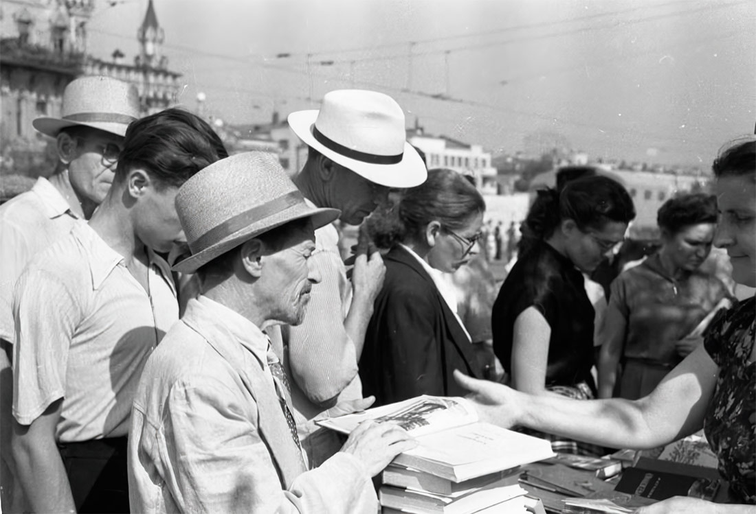 Уральский писатель А. И. Исетский на книжном базаре, на пр. Ленина. 1959 год.