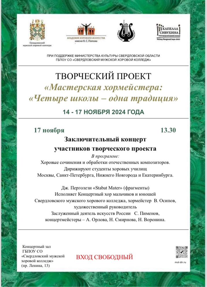 Свердловский Мужской Хоровой Колледж «ЧЕТЫРЕ ШКОЛЫ — ОДНА ТРАДИЦИЯ» ![]() ✔ Крупный хоровой проект «Мастерская хормейстера: «Четыре школы – одна традиция», который состоится в Екатеринбурге в период с 14 по 17 ноября 2024 года на базе Свердловского мужского хорового колледжа, обещает стать значимым событием в культурной жизни региона. ✔ В рамках настоящего проекта из воспитанников хоровых училищ Москвы, Санкт-Петербурга, Нижнего Новгорода и Екатеринбурга создадут хор, который на время проведения «Хоровой мастерской» станет творческой лабораторией: под руководством наставников участники будут работать над хоровыми сочинениями, а 17 ноября в 13:30 часов в концертном зале колледжа пройдет Гала-концерт. Источник -------------------- |