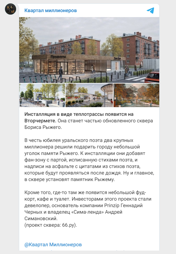 17 сентября Сквер на Вторчермете, находящийся рядом с остановкой «Сухоложская», будет носить имя знаменитого уральского поэта Бориса Рыжего, 50 лет со дня рождения которого исполнилось 8 сентября ![]() Постановление о присвоении скверу имени Бориса Рыжего приняла 16 сентября администрация Екатеринбурга, сообщает «КП-Екатеринбург». Сквер расположен возле дома по улице Титова, 44. Здесь с 1980 года проживала семья Бориса Рыжего. Вторчермет и улица Титова нашли свое отражение в творчестве поэта. ![]() В 2001 году жена Ирина нашла Бориса Рыжего мертвым в их екатеринбургской квартире. «Я вас любил. Без дураков», — гласила предсмертная записка. На тот момент ему было всего 27 лет, сообщает «КП-Екатеринбург». В настоящее время готовится проект благоустройства сквера, в котором будет установлен памятник Борису Рыжему, сообщает Telegram-канал «Екатеринбург Главное». На доме поэта установлена мемориальная доска. О жизни и творчестве Бориса Рыжего снят художественный фильм «Рыжий», но с прокатом картины возникли проблемы. Источник -------------------- |