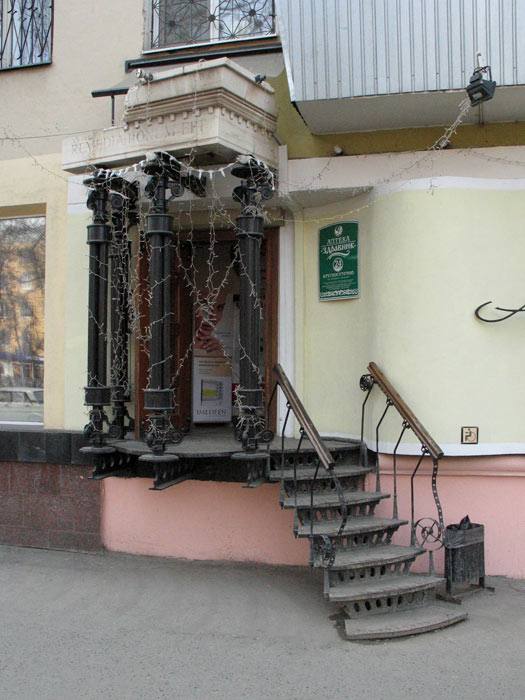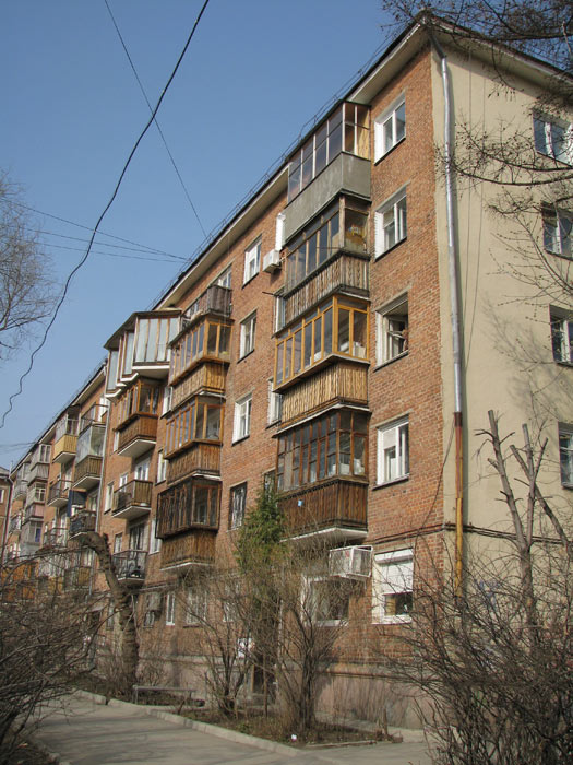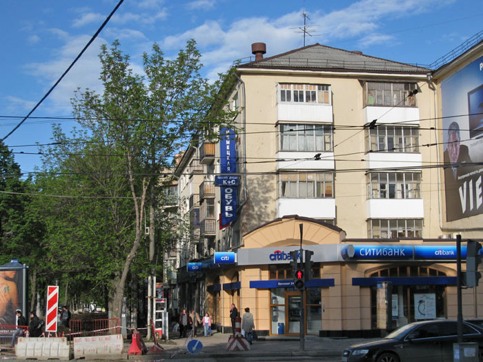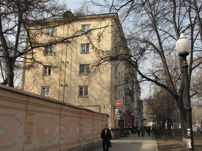 Первый этаж раньше был жилым, сейчас полностью занят магазинами и конторами.