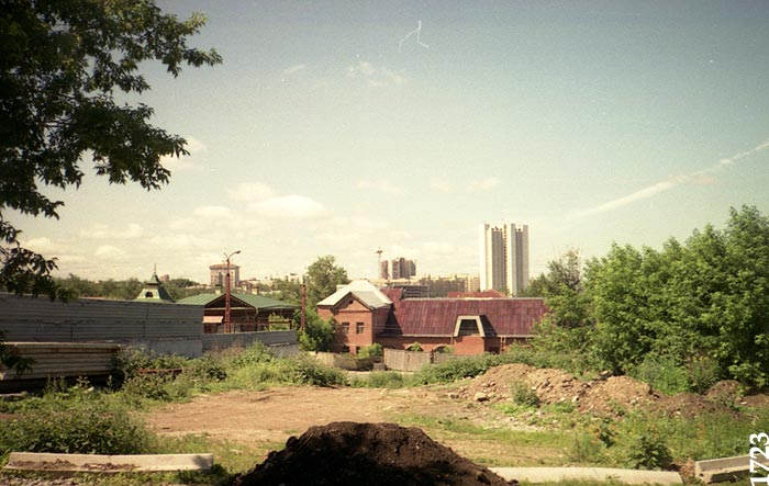 Вид от деревянной часовни на запад. В центре снимка восточный фасад Камерного театра. А на пустыре сейчас стоит в полудостроенном состоянии Патриаршее подворье.