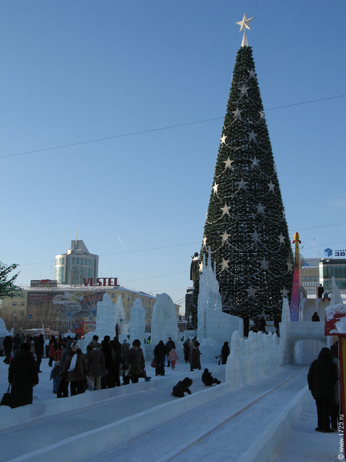 Ёлка 2010-2011 "Космос как предчуствие" В этом году у нас Космос. Городок посвящён 50-летию первого полёта человека в космос. Тема горки интересная, но раскрыта она не полностью. Общий вид на ледовый городок, который потерялся на фоне ёлки. Вид с перекрёстка Ленина - 8 Марта.