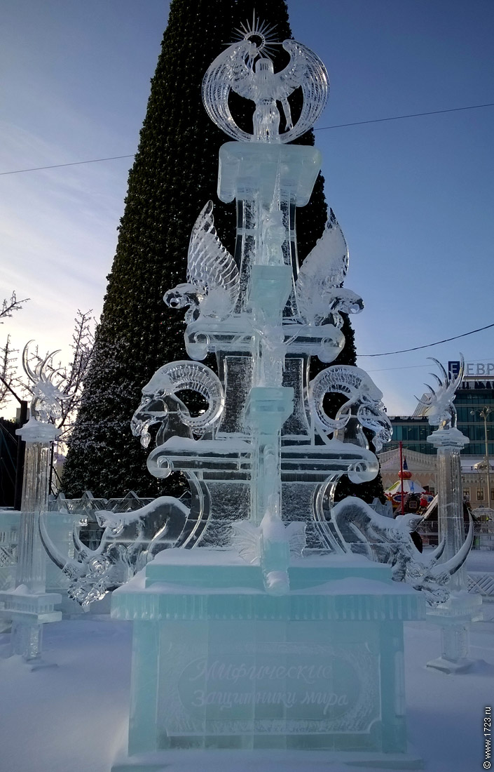 Сккульптуры Деда Мороза и Снегурочки. Входная арка "Орден победы" Детская горка в виде танка. Детская горка в виде самолёта. Детская горка в виде "Катюши". По периметру забора города-герои. Композиция "Мифические защитники мира". Команда "Love ice I", Япония. Композиция "Ника". Команда "Айсбург", Польша-Екатеринбург. Композиция "Бесконечная борьба". Команда "Борцы". Екатеринбург. Композиция "Галактический пилигрим". Команда "Поморы". Архангельск. Композиция "Сила жизни". Команда "Артелька". Прокопьевск. Композиция "Спасибо". Команда "Айсберг". Нижний Тагил. Композиция "Дни и ночи у мартеновских печей не смыкала наша родина очей". Команда "Айсхаус". Новоуральск. Композиция "Доброму гостю - хлеб да соль, ворогу - меч". Команда "Русские медведи". Артёмовский - Нижний Тагил. Композиция "Полёт". Команда "Экипаж". Болгария - Екатеринбург. Композиция "Танец жизни". Команда "Дам". Кировск (Мурманская область) - Хабаровск. 01.01.2015