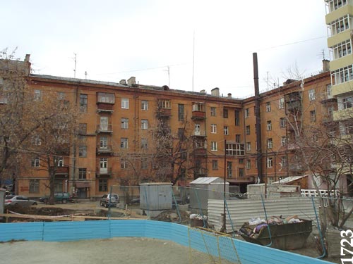 Дворовой фасад выглядит более скромно, без облицовки верхних этажей.