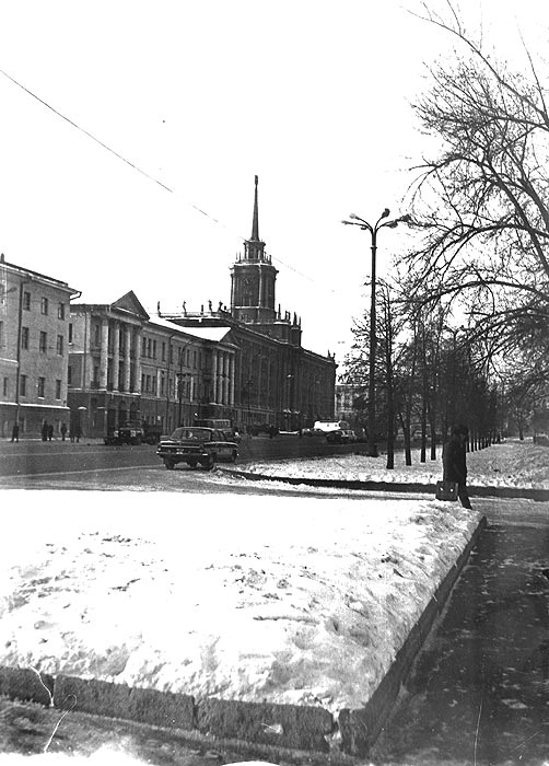 Слева фрагмент ТЮЗа. На главном фасаде ещё не установлено панно и скульптурная композиция