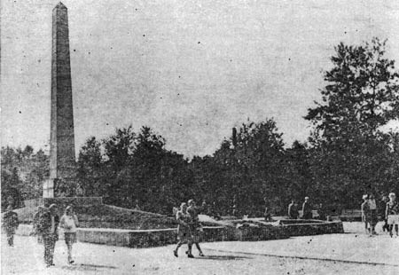1 мая 1920 года здесь установили один из самых первых революционных памятников, символизирующий освобожденное человечество. 15 июля 1929 года возле братской могилы состоялся митинг, посвященный 10-летию освобождения города от белогвардейцев. По снимку того времени ясно видно, что тут стоял гранитный столб. В 1959 году у братской могилы