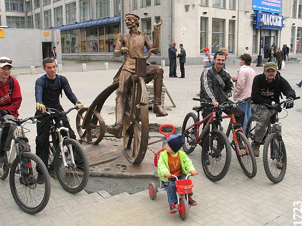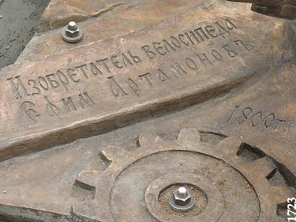 Официальное название памятника Изобретателю велосипеда Ефиму Артамонову, или просто - Дедушке уральского маутинбайка.