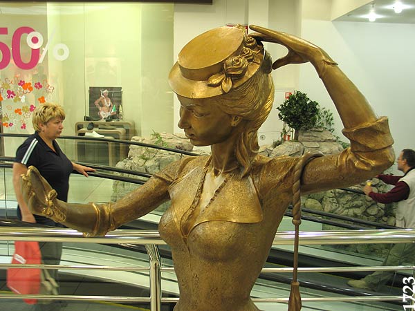 Неделька 14-20 августа 2006 год Новая внутренняя скульптура торгового центра "Гринвич". Часть 1. Всего было установлено 6 бронзовых скульптур. Заходим в торговый центр со стороны улицы Вайнера и нас встречает Чистильщик обуви. Чистильщик отполировал ботинок гигантского человека-невидимки и просит за работу деньги. Смотришь на него и представляешь себе Шуру Балаганова в молодости. Вот уже сколько начистил ---------------------------------------------------------------------------------------------------------------------------------------------------- Скульптура №2 Назовём её Щёголь. Как денди лондонский одет... А смотрит наш герой в сторону скульптуры №3. ---------------------------------------------------------------------------------------------------------------------------------------------------- Скульптура №3 «Мадемуазель». Прихоращивается в ожидании скульптуры №2. Мадемуазель смотрит в зеркало И совсем недурна собой Смотрим продолжение 22.08.2006